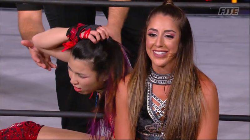 The two would trade forearm strikes, which would result in a bloody nose for Baker. Shida would hit a falcon arrow for the 2 count. Baker transitioned the kick out into the Lock Jaw and as the blood run down her face Baker screamed to the referee for his surgical gloves before she would apply the mandible claw.