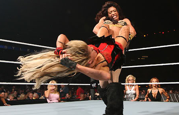 Melina left the match victorious, defeating the Diva Search winner with a roll-up. The action wasn’t over, though: the lumberjills starting brawling, allowing the champ to make a hasty exit.