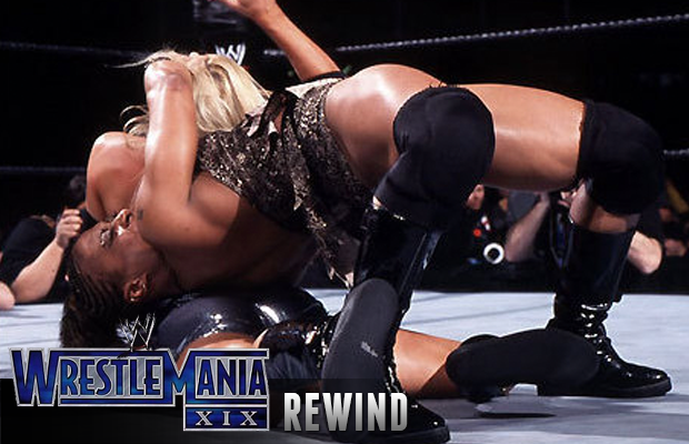 At the nineteenth WrestleMania, Victoria was still in the midst of her first Women’s Title reign, having won the belt from Trish Stratus in a Hardcore match at Survivor Series. On the grandest stage of them all, she put the belt on the line against Trish and Jazz.