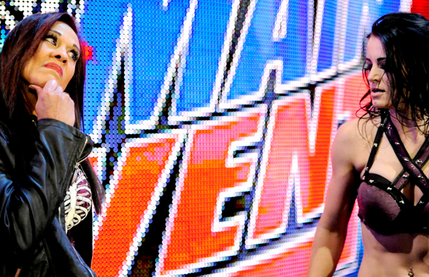 After the match, Paige has a stare down with her challenger for Extreme Rules, Tamina Snuka. And by stare down, I mean Paige had to try not to laugh at Tamina’s wonky contact lens. LOL.
