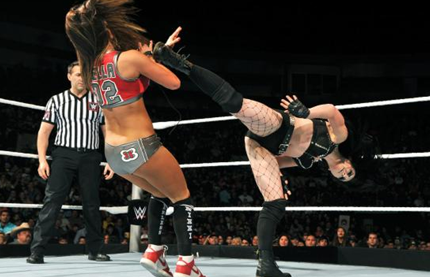 Paige climbs to the second rope, but it distracted by Brie, who waves a shiny object (the Divas Title) in front of her. Perhaps distracted by its Barbie-style hideousness, she doesn’t notice Nikki until it’s too late, and the Divas Champ sends her flying off the second rope, dragging her by her bad arm. Natalya avenges Paige, though, attacking Brie with a clothesline on the outside. Nikki gets her own revenge, kicking Natalya through the ropes and laying her out as well.
