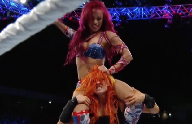 Sahsa turns the failed pin attempt into another arm attack, twisting the arm a bit and then dropping her face-first onto the mat. As Becky recovers, Sasha taunts her, mocking her trademark hand gestures and tongue wagging. She pulls Becky up by her hair, but Becky starts to fight back, fending her off with a series of blows. When she goes to whip Sasha into the ropes, though, it’s reversed, and Sasha takes Becky off her feet. She attempts another pin, but Becky again kicks out.