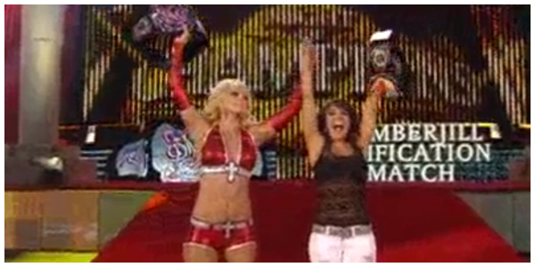 The parts of the match that stand out the most to me are the beginning when Melina is down in her split entrance. Michelle has attacked her before from that position but this time the savvy vetran was waiting for her. All the Lumberjills ganging up on Michelle was another highlight. We’ve never seen that in one of these matches before and it was nice seeing everyone play a role tonight. Last but not least, Rosa’s epic fail with Jillian was another highlight. I’m not sure what happened there but Rosa got real confused. It was a nice little hot mess and you know me! I looooove hot messes!