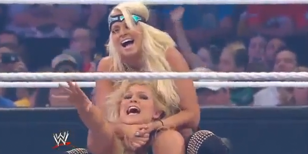 Maryse removes the headband, slaps Beth and, deciding to renew the humiliation, makes a show of putting back on the headband. This preoccupation costs her, though, and Beth spears her in the corner, hitting her with a relentless series of body punches. She hits a springboard suplex and goes for the pin, getting a 2-count. Beth pulls Maryse to her feet, picking the lost headband off the mat and punches her in the head with it. She then tosses it aside, which makes sense because unless that headband’s loaded with a pair of brass knuckles it isn’t going to get the job done. She whips Maryse into the ropes, but Maryse ducks her attack, spinning around and kicking Beth in the back. She attempts a pin, but Beth kicks out.