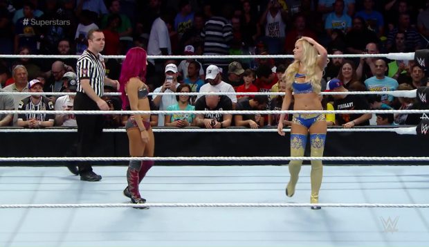 This week on WWE Superstars, fans were treated to the second match up in Sasha Banks and Summer Rae‘s budding feud. The two former BFFs have been colliding since Sasha’s recent return to the ring earlier in the month. This week, there were not any lengthy promos between the two adversaries, rather we headed straight into the action.