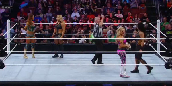 Beth’s jaw drops, as Natalya plays along and sprints about the ring. She applies a waist lock until Phoenix slams her out of the ring and tags in Eve. Torres climbs down the ring steps, before kicking Nattie in the back and tossing her back in the ring. Torres then attempts a pin to no avail, as she sends Natalya into the corner and continues the pain with a Stratusfying choke hold. Neidhart tries to make the tag, but Eve goes for a pin. Natalya breaks out instantly, which then provokes Eve to lock in a fancy double arm choke submission. Natalya lets out an earth shattering scream as Tamina cheers her partner on. Finally, Nattie is able to get out as she NAILS Eve with a discus clothesline and tags in Tamina!