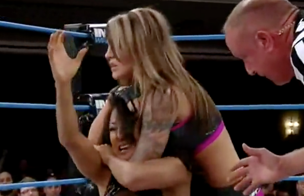 Velvet pulls Gail into a sleeper hold, but Gail quickly rallies, battling out of the hold and running the ropes. Velvet halts her with a kick to the stomach and the head, hitting a neckbreaker and going for another pin. Gail kicks out.