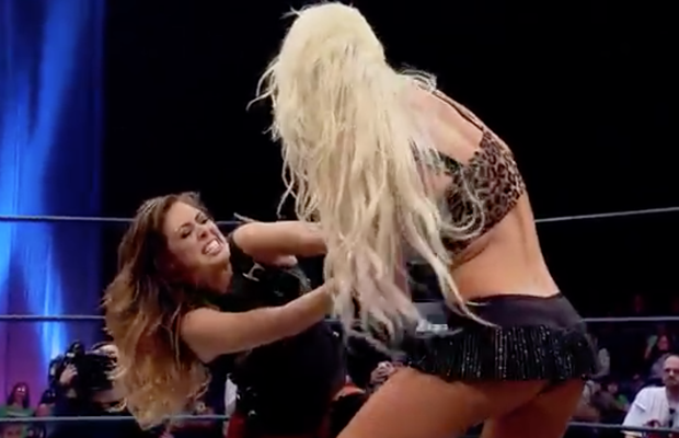 Rebel dodges a clothesline from Angelina and locks in a headlock submission. The hold isn’t for very long as Angelina slips away and pulls Rebel’s leg from behind causing Rebel to fall face first on the mat.
