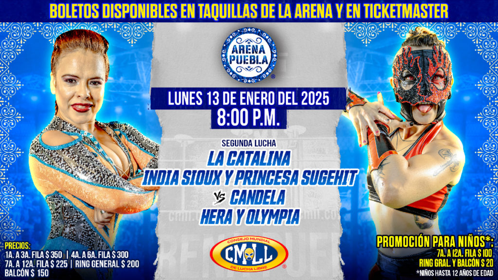 Hello everyone! This past Monday from la Arena Puebla, La Catalina, teamed up with veterans India Sioux and Princesa Sugehit, against Hera, Olympia and “La Bruja Vudú” Candela in a six amazonian’s tag team match.